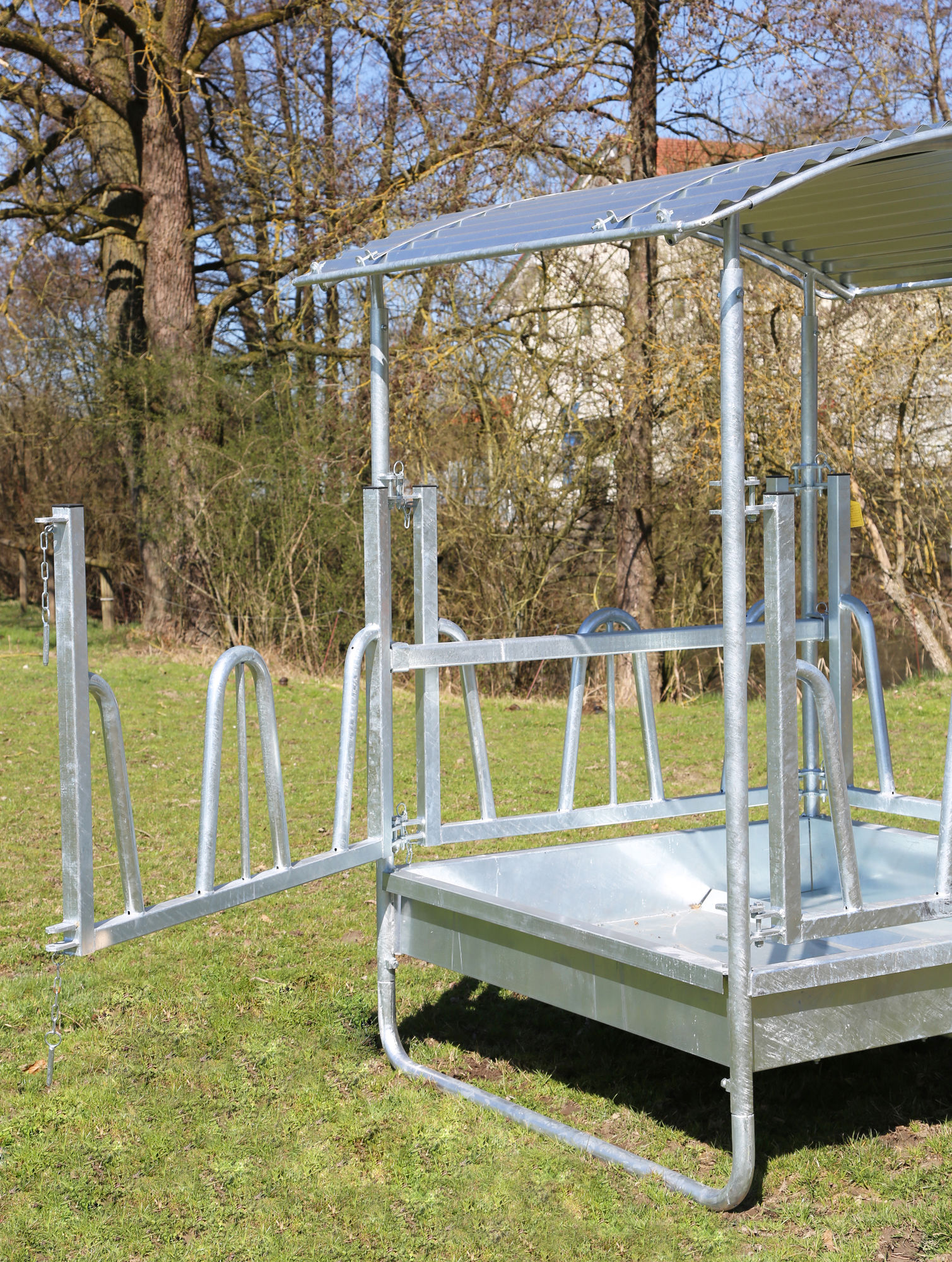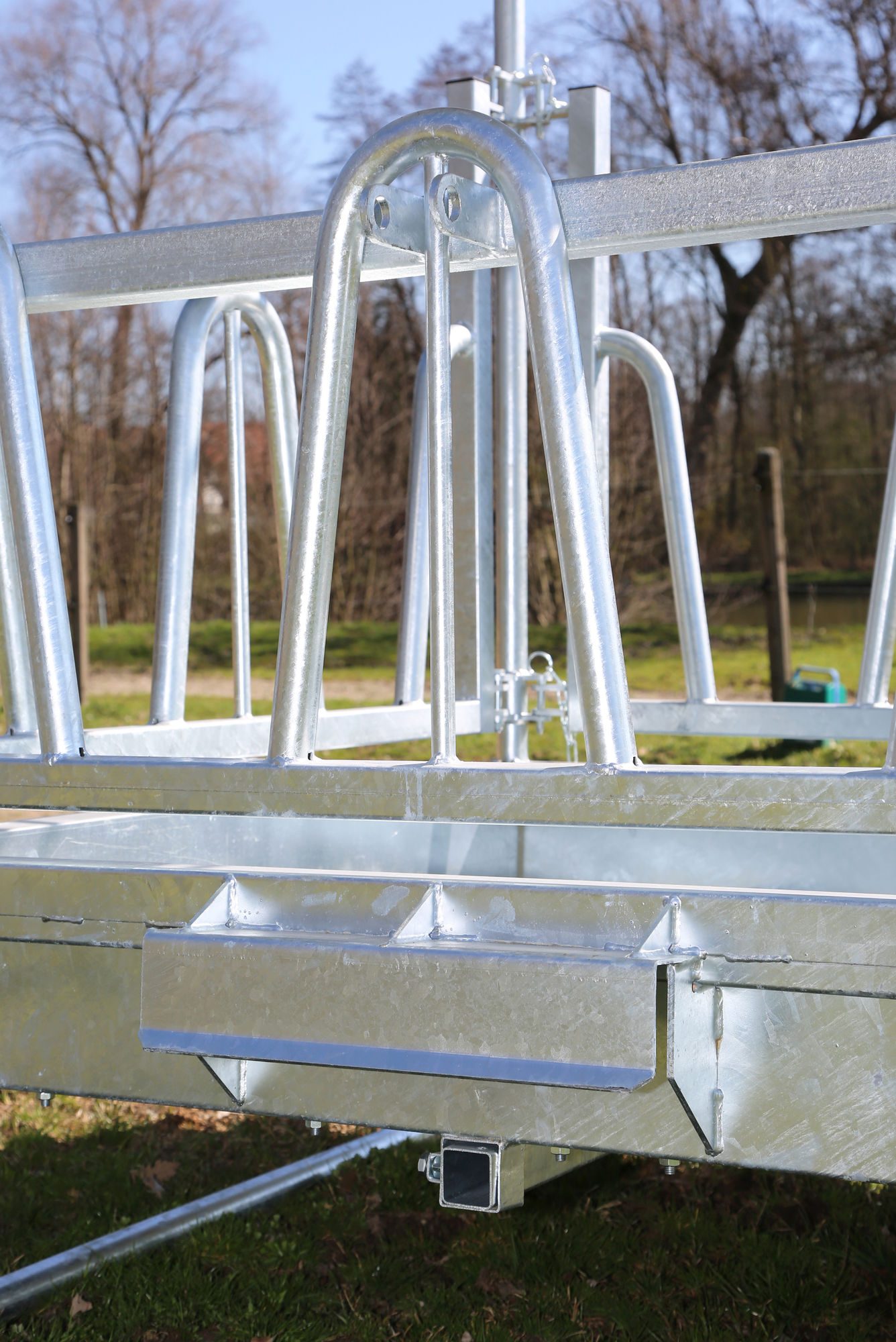 Die Viereckraufe Hobby mit 8 Fressplätzen ist eine stabile, feuerverzinkte Heuraufe, die für Rund- und Rechteckballen bis zu 1,4 m Länge oder Durchmesser geeignet ist. Sie verfügt über eine Wanneninnengröße von ca. 1,45 × 1,45 m und eine Gesamthöhe von etwa 2,4 m. Dank höhenverstellbarer Kufen lässt sie sich an die Größe der Tiere anpassen. Zum Befüllen können zwei Seiten einfach geöffnet werden. Die Raufe ist mit einer Dreipunktanhängung ausgestattet und wird als Bausatz geliefert, inklusive umlaufendem Dachkantenschutz und Dreipunkt-Schutzbügel. Für den Transport ist sie mit einer Dreipunktanhängung ausgestattet. Die Konstruktion minimiert Futterverluste und sorgt für eine effiziente Fütterung.