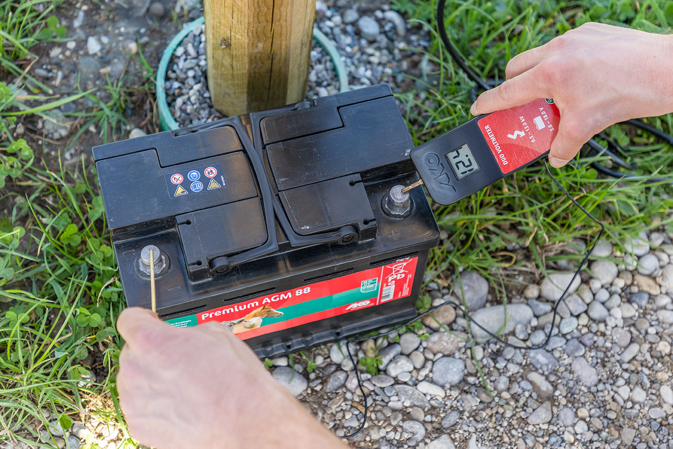 - herkömmliche Zaunvoltmeter messen nur die Zaun(hoch)spannung aber sie können die niedrigeren Batteriespannungen nicht ablesen