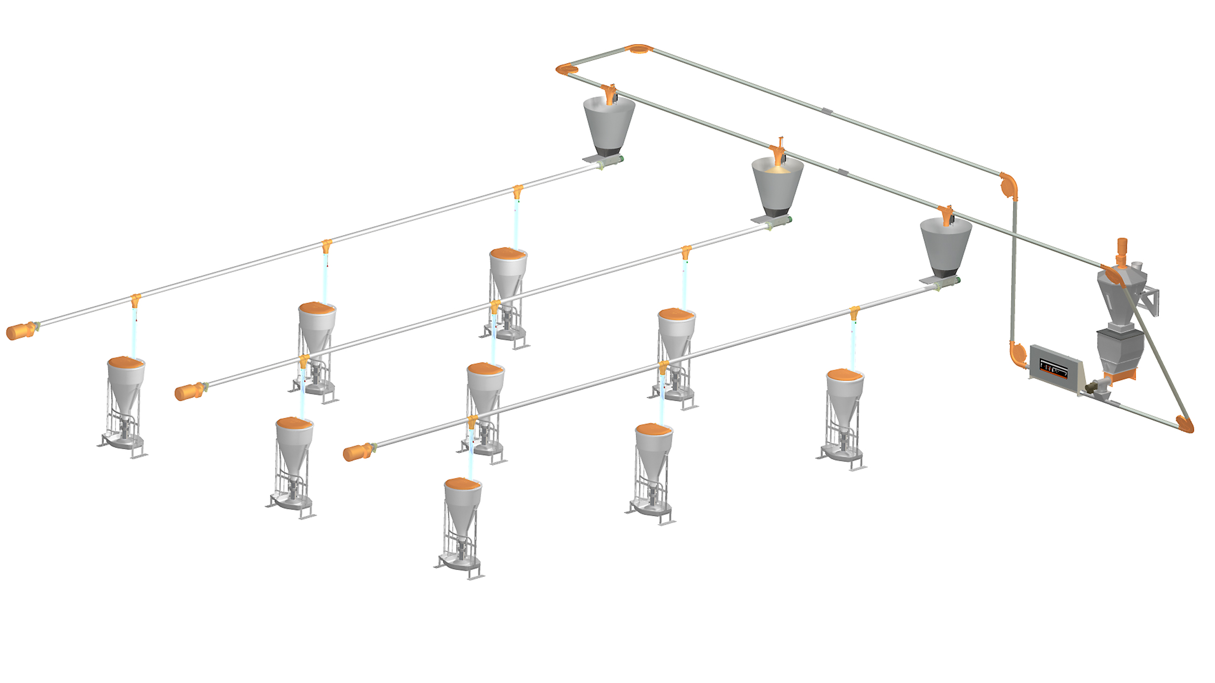 Jeder Unterkreislauf kann mit einer eigenen Futtersorte oder Mischung versorgt werden, was dir maximale Flexibilität bei der Futterzusammenstellung bietet. Mit diesem Automatisierungssystem ist eine einfache und effiziente Futterversorgung in Großanlagen realisierbar, die sowohl Zeit spart als auch die Produktionsqualität steigert.