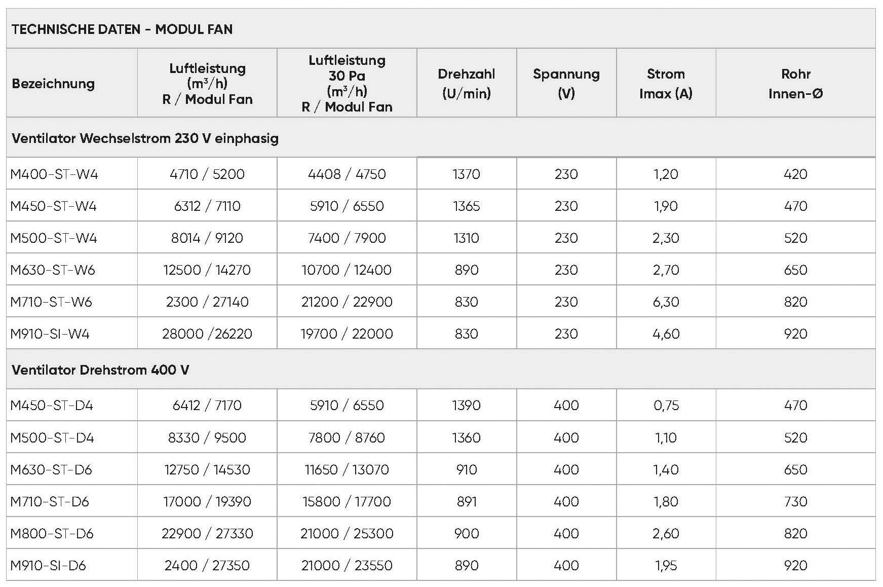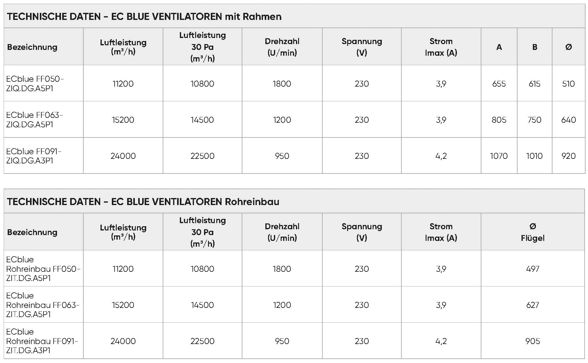Die Ventilatoren zeichnen sich durch Laufruhe, Druckstabilität, gute Lagerung und ein hohes Leistungsvermögen aus. Die Ausführungen sind als Drehstrom- oder Wechselstrom-Läufer erhältlich. Eine formschlüssige Verbindung von Rohr und Modul und glatte, harte Oberflächen sorgen für optimale Reinigungsmöglichkeit. Durch das exakt runde Rohr ist der Abstand zwischen Flügel und Rohr bei jeder Drehposition gleich. Das bringt optimale Leistungen. Das Material aus FCKW-freiem PU-Hartintegralschaum mit hohem Isolationswert reduziert die Bildung von Kondenswasser. Aufnahmen und Verschluss aus PA-Kunststoff inkl. Gummilager.