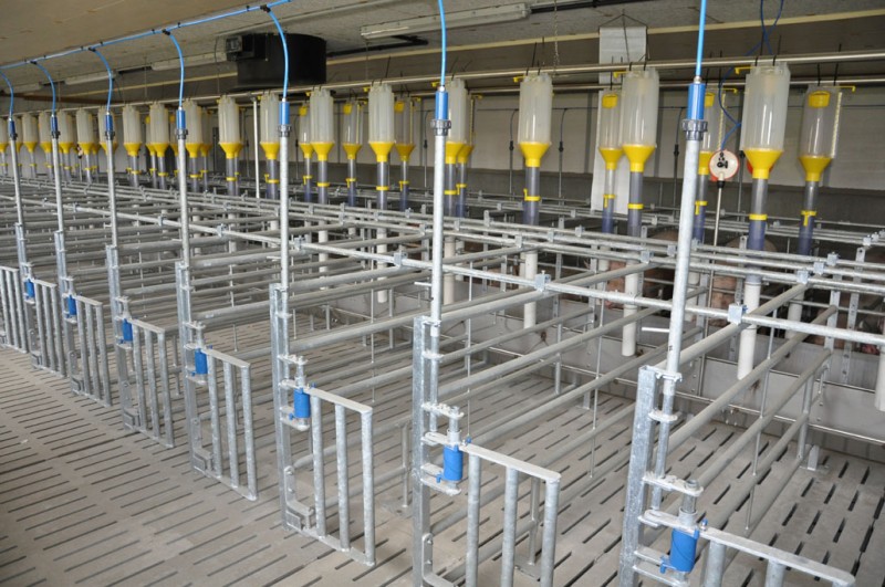 Die Eingangstür überzeugt durch ein langlebiges und lautloses Kunststoffscharnier. Bei entriegeltem Zustand können die Sauen einfach und stressfrei ein- und ausgehen. Die Gruppenverriegelung erfolgt pneumatisch und gewährleistet so eine zuverlässige Steuerung und sichere Fixierung der Tiere. Sowohl eine Einzelverriegelung als auch eine Einzelentriegelung sind jederzeit möglich.